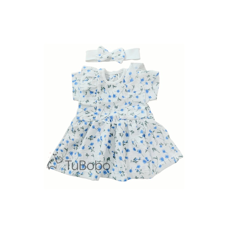 Muślinowa sukienka w niebieskie kwiatuszki+opaska