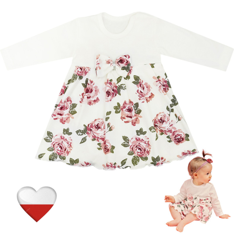 Eleganckie body z sukienką z bawełny organicznej w kolorze ecru z nadrukiem w róże to ubranko nie tylko na wyjątkowe okazje, ale także na co dzień. Sukienka została uszyta z delikatnej biobawełny, która jest w pełni bezpieczna dla Twojej córeczki.