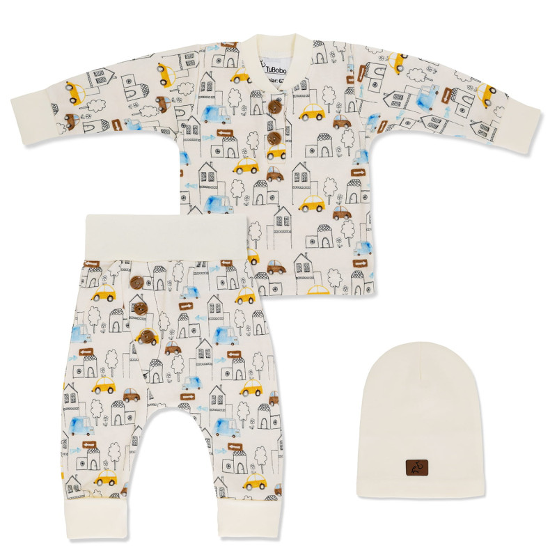 Trzyelementowy komplet chłopięcych ubranek w kolorze ecru w autorskim wzorze Auta sprawdzi się świetnie na chłodne, jesienne dni. Spodenki rosnące razem z maluszkiem, bluzeczka na długi rękaw zapinana na guziki i czapeczka są uszyte z bawełny organicznej, która jest wyjątkowo miękka i przyjemna w dotyku. Biobawełna jest także bezpieczna dla wrażliwej skóry dziecka.