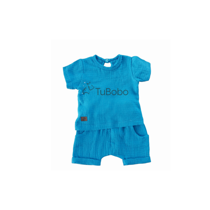 Muślinowy komplet dla wykonany jest z delikatnego i przewiewnego muślinu, idealnego na ciepłe letnie dni. Materiał ten jest lekki i przyjemny w dotyku, zapewniając dziecku komfort noszenia.