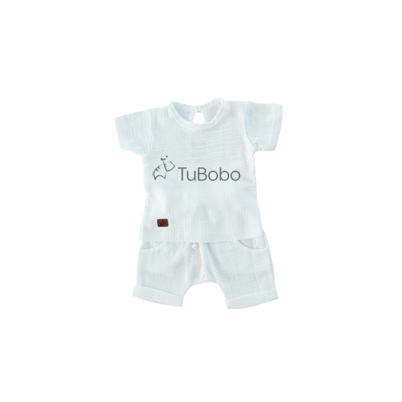 Muślinowy komplet wykonany jest z delikatnego i przewiewnego muślinu, idealnego na ciepłe letnie dni. Materiał ten jest lekki i przyjemny w dotyku, zapewniając dziecku komfort noszenia.